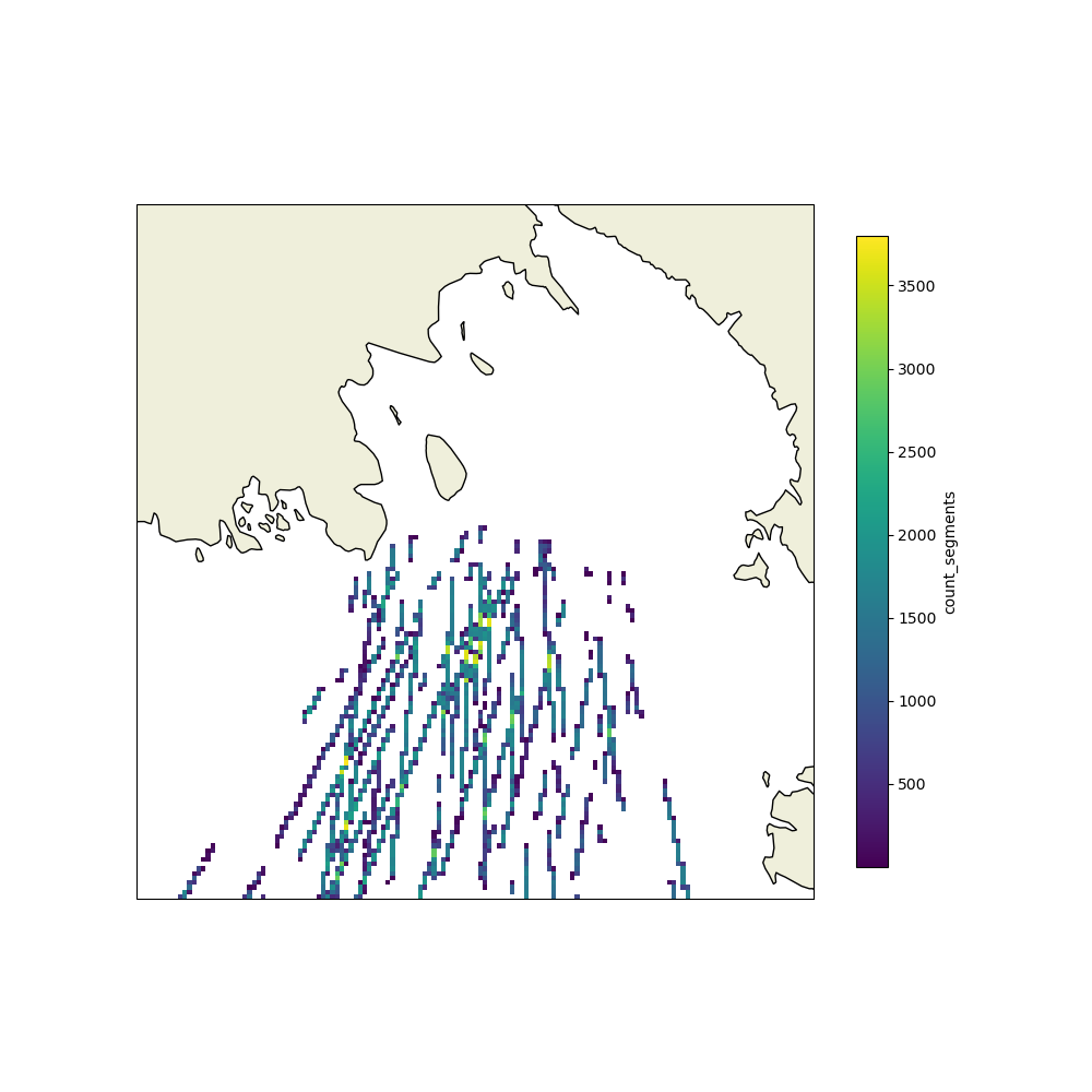 - Grid track data to EASE-Grid v2 6.25 km projected grid using drop-in-the-bucket resampling.